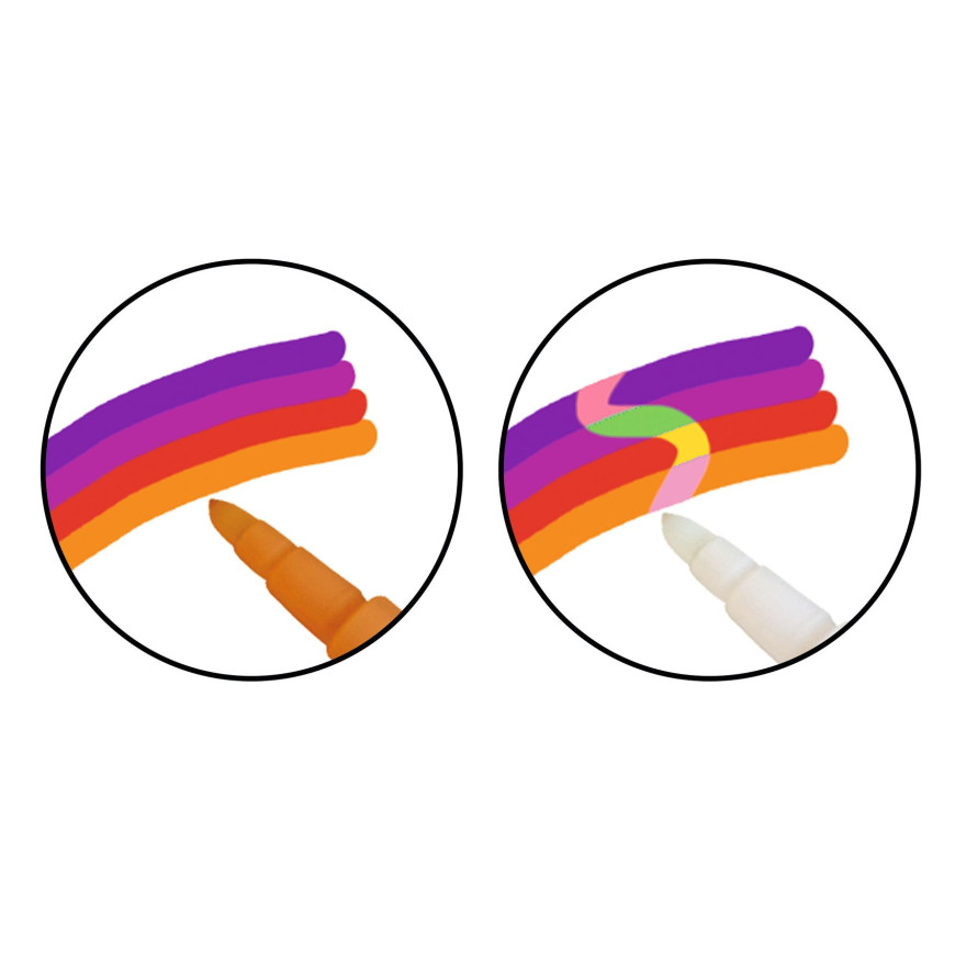 Un kit magico per colorare, adatto ai bambini dai 3 in su. I bambini colorano e poi passano il pennarello trasparente. Che magia: i colori cambiano!