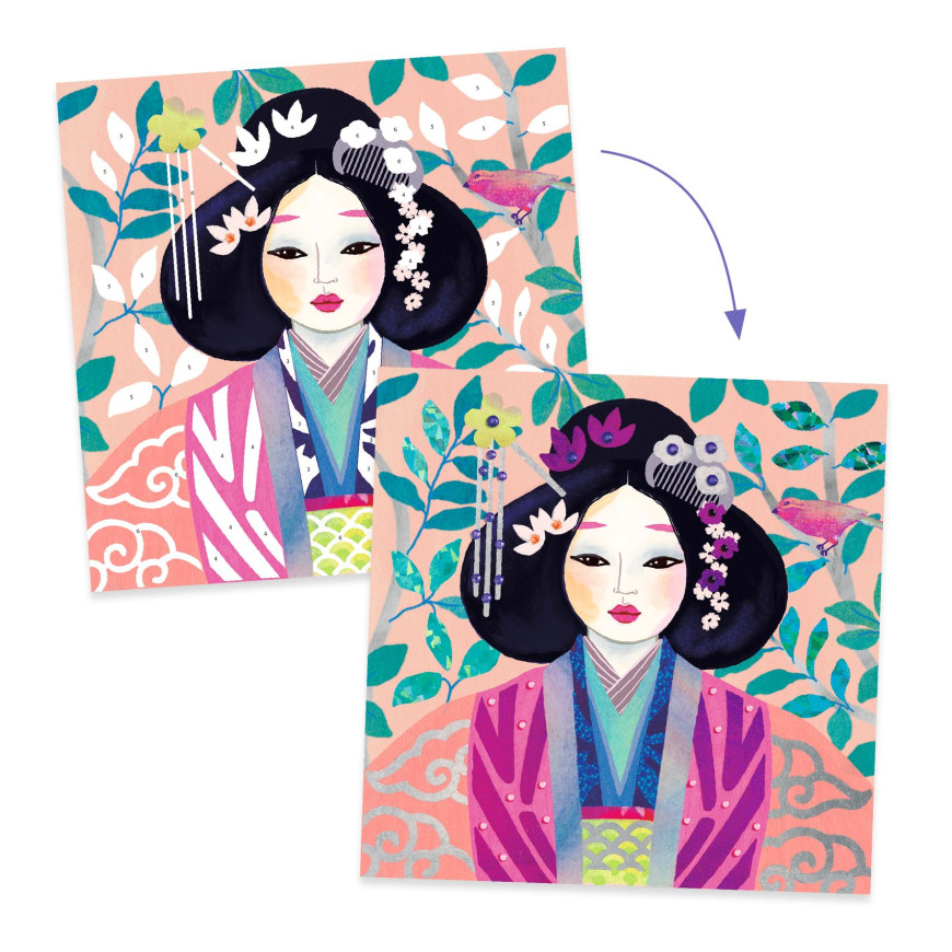 Grazie ai codici colori indicati sulle schede, il bambino o la bambina identifica le aree da metallizzare. Scopre la pellicola che protegge la superficie incollata, quindi vi colloca il foglio metallizzato. Il materiale si deposita come per magia! In seguito, incolla i brillantini per illuminare i quadri.