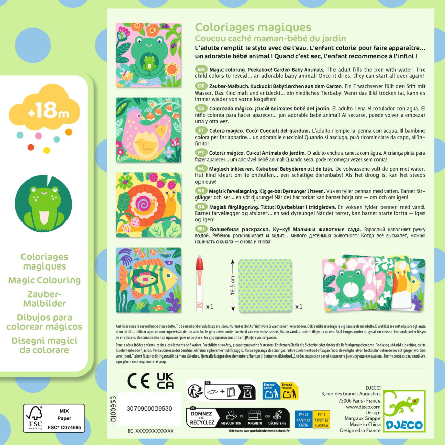 Una cartellina di colorazione con acqua adatta ai bambini e alle bambine a partire da 18 mesi. Il bambino o la bambina colora con il pennarello ad acqua le parti bianche per scoprire cosa si nasconde sotto. E come per magia appaiono cuccioli di animali! Le schede si asciugano e il bambino o la bambina ricomincia!