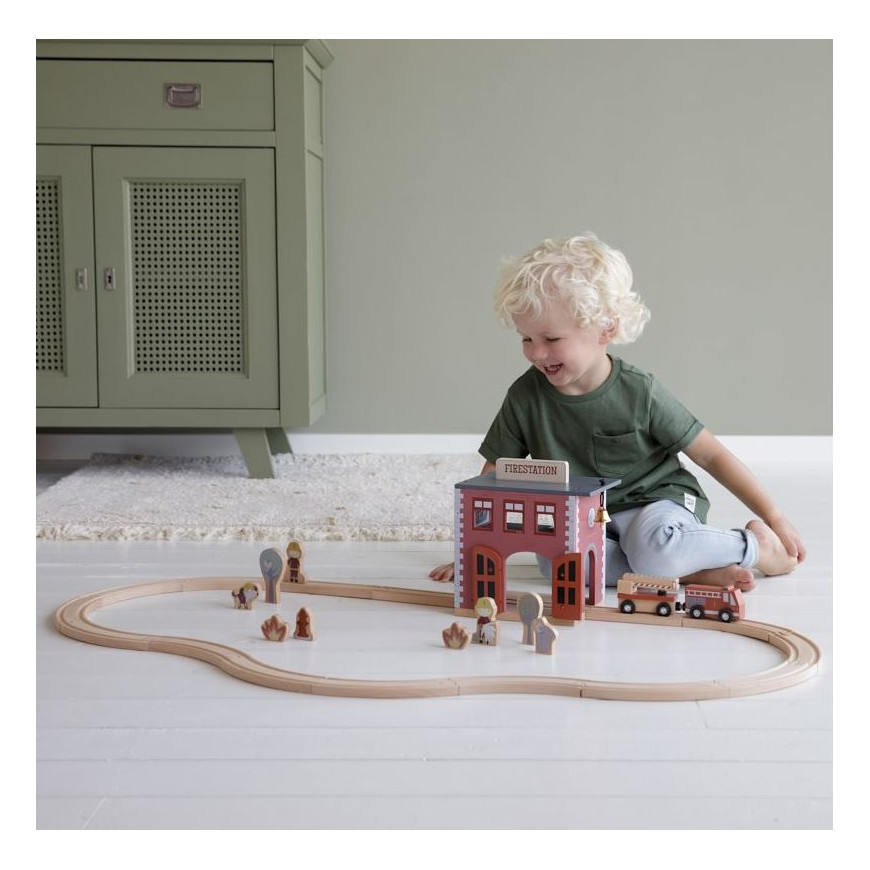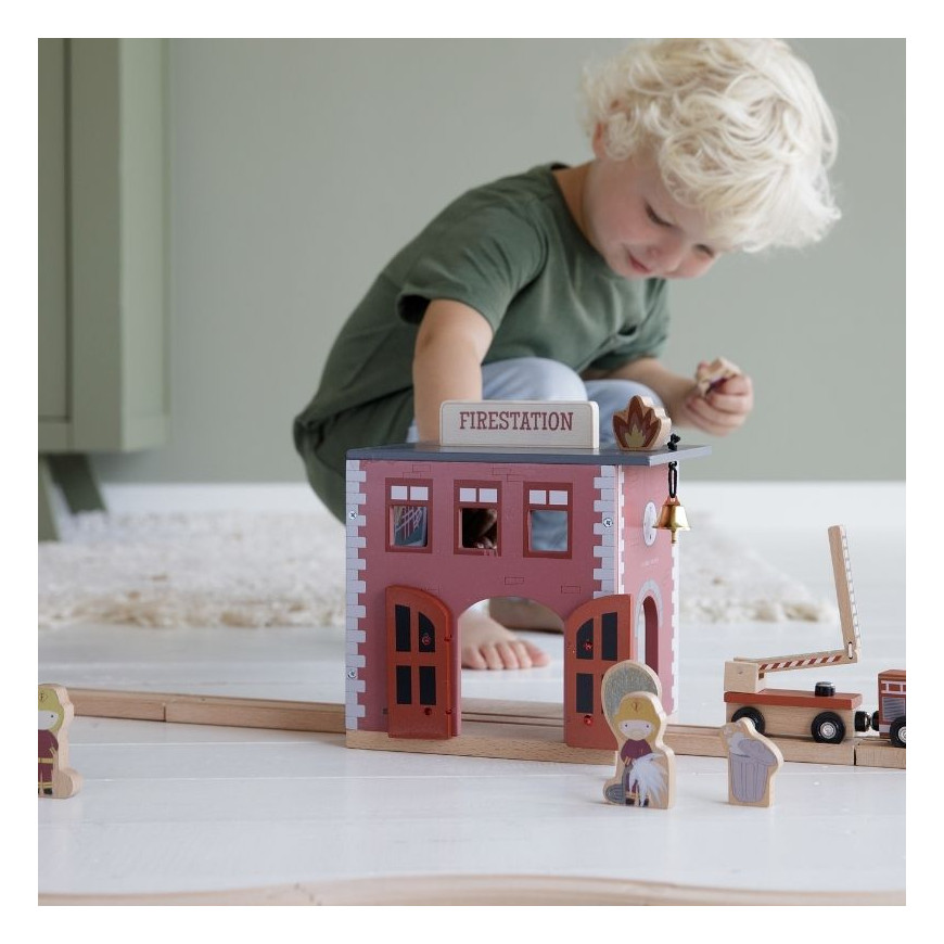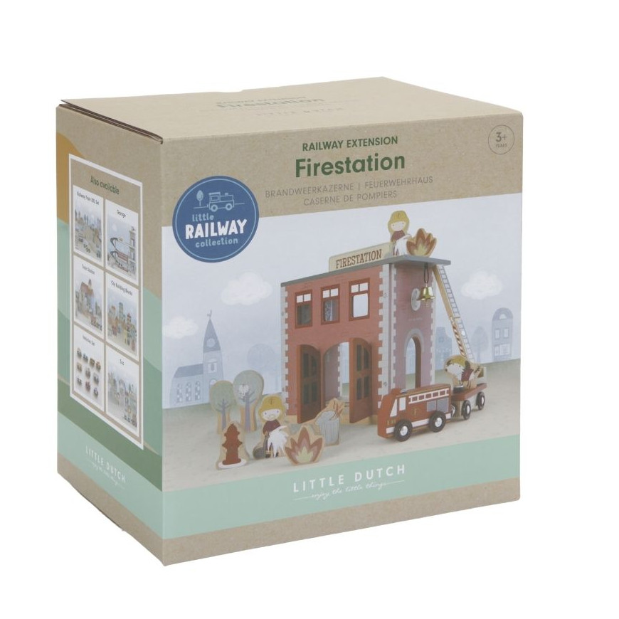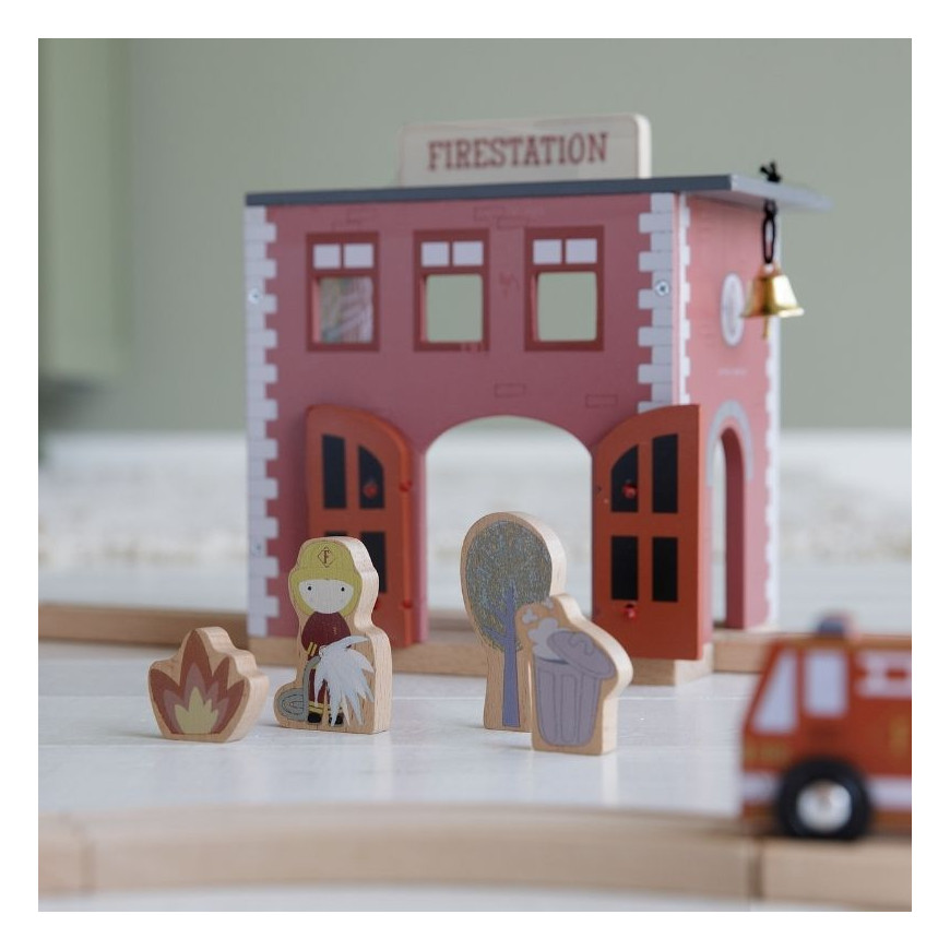 C'è un incendio da qualche parte? Apri rapidamente le porte e lascia passare l'autopompa. Oh no! È un gattino bloccato su un albero! Fortunatamente, i vigili del fuoco vengono in soccorso. Questa caserma dei vigili del fuoco in legno è uno dei tanti set di estensione che possono essere collegati al set XXL del trenino olandese. Ciascun elemento in legno ha illustrazioni dettagliate su entrambi i lati.