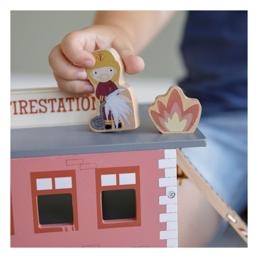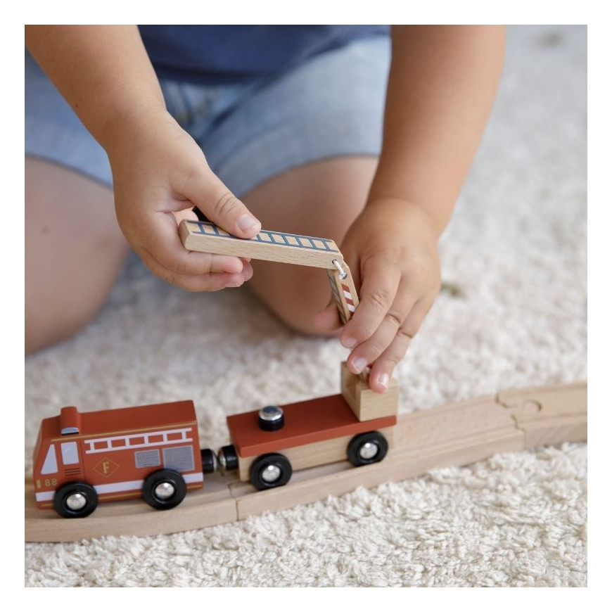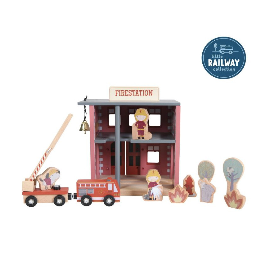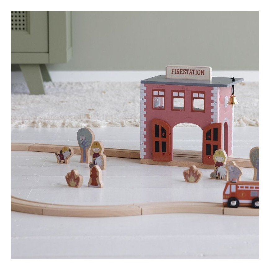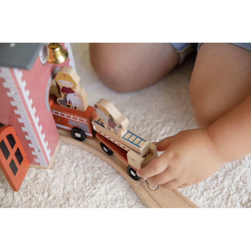 C'è un incendio da qualche parte? Apri rapidamente le porte e lascia passare l'autopompa. Oh no! È un gattino bloccato su un albero! Fortunatamente, i vigili del fuoco vengono in soccorso. Questa caserma dei vigili del fuoco in legno è uno dei tanti set di estensione che possono essere collegati al set XXL del trenino olandese. Ciascun elemento in legno ha illustrazioni dettagliate su entrambi i lati.