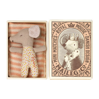 Un classico di Maileg. Questo topolino è pronto per ore di gioco e dorme in una piccola scatola di fiammiferi. I vestiti e le lenzuola sono disponibili in stampe uniche e in bellissimi colori. 2 maschere incluse.