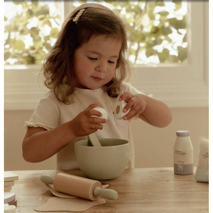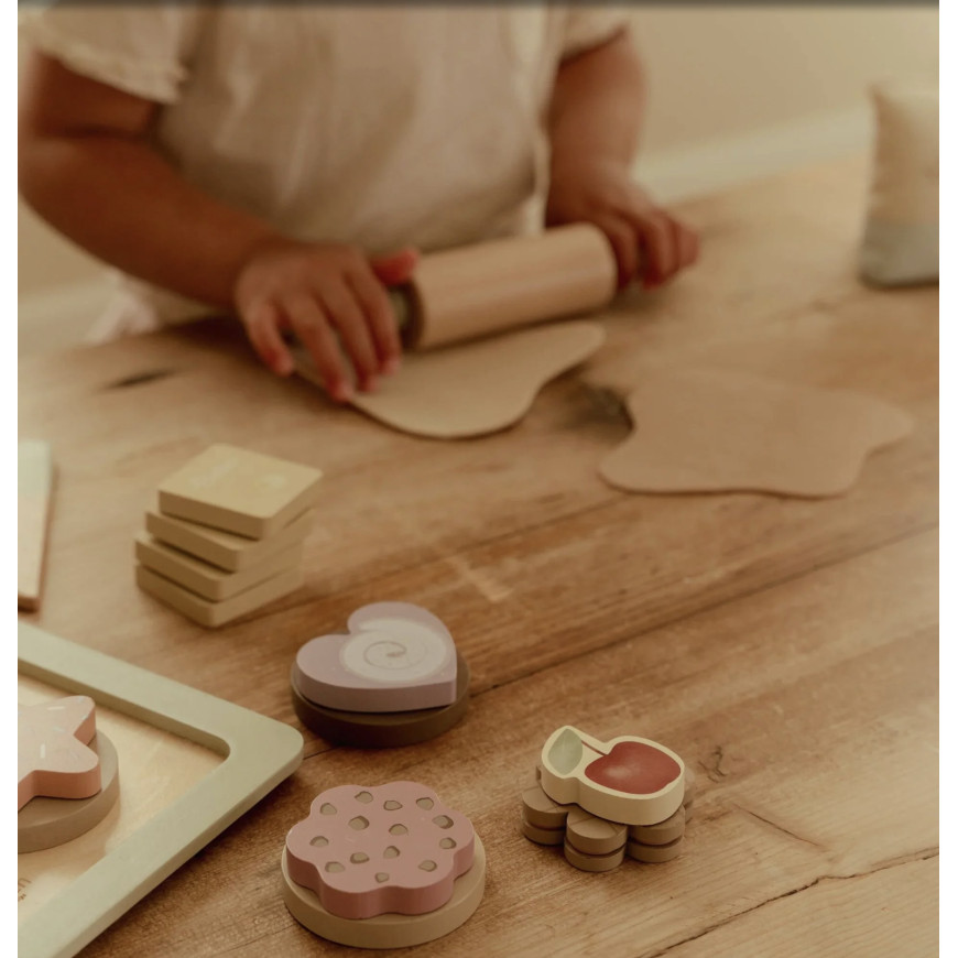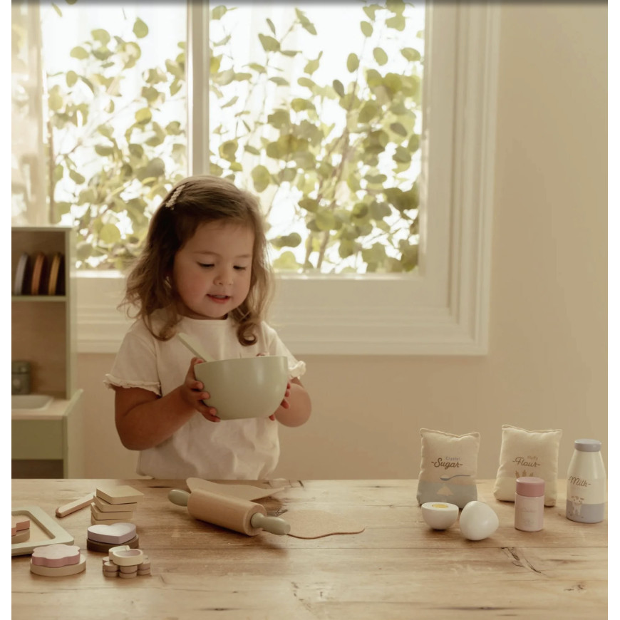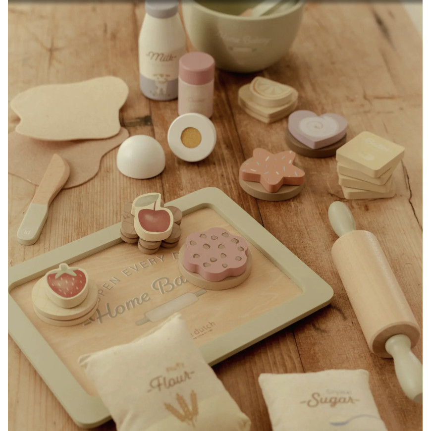 Con questo set da forno in legno, i piccoli fornai impareranno tutto su come preparare deliziosi biscotti e pasticcini. Il set include una scheda ricetta e tutti gli elementi essenziali, come una ciotola, una teglia con biscotti, guarnizioni, un uovo, burro, farina, zucchero, latte e persino granelli colorati. Stendi la pasta di feltro con il mattarello e decora i biscotti a piacere. Preapara i tuoi dolci e informali nel forno della cucina: Cucina Little Dutch