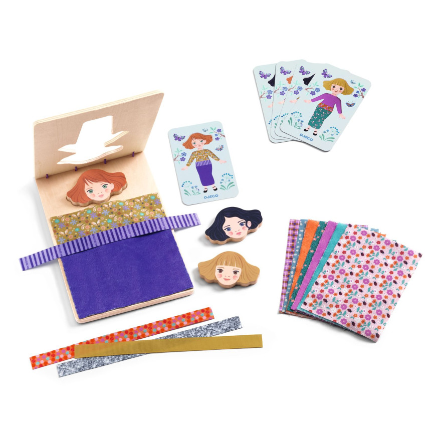 1 base di legno, 3 teste di legno, 9 pezzi di tessuti stampati, 4 nastri stampati e 5 carte stampate fronte retro.
