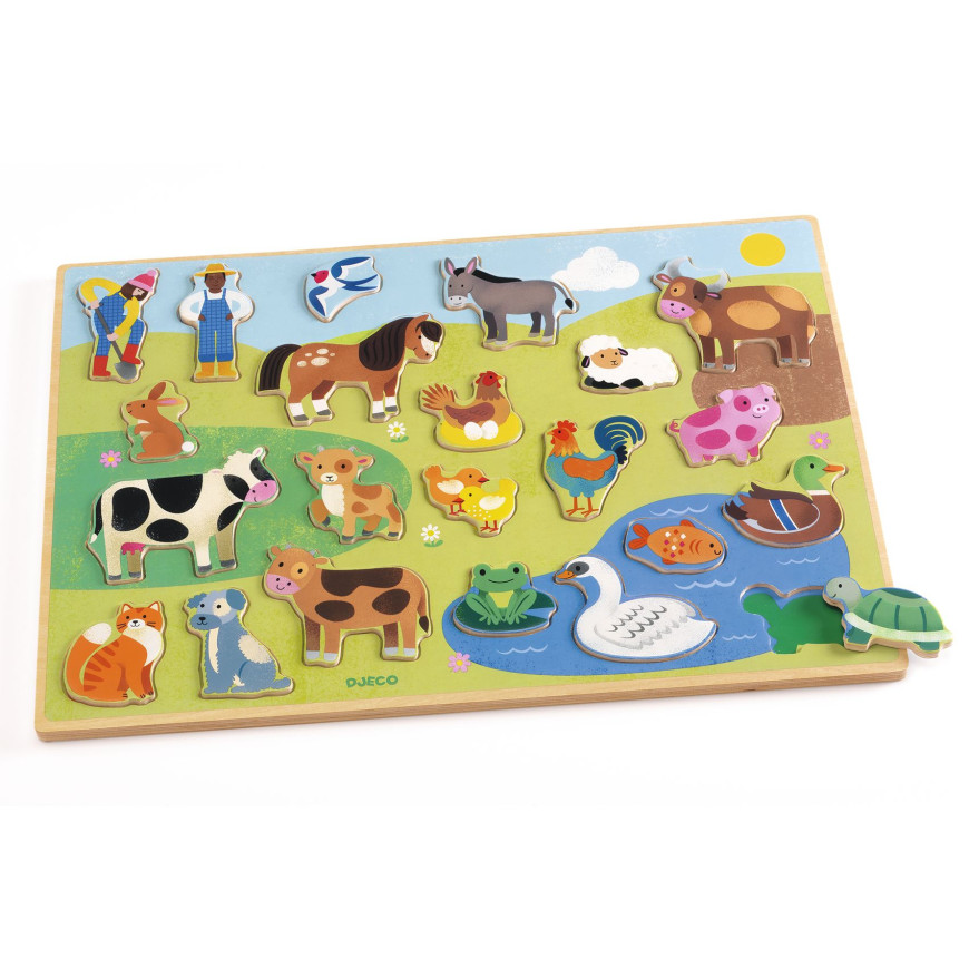 Un puzzle di legno sul tema della fattoria. Il bambino o la bambina posiziona i 22 pezzi identificando le sagome degli animali della fattoria sul tabellone.