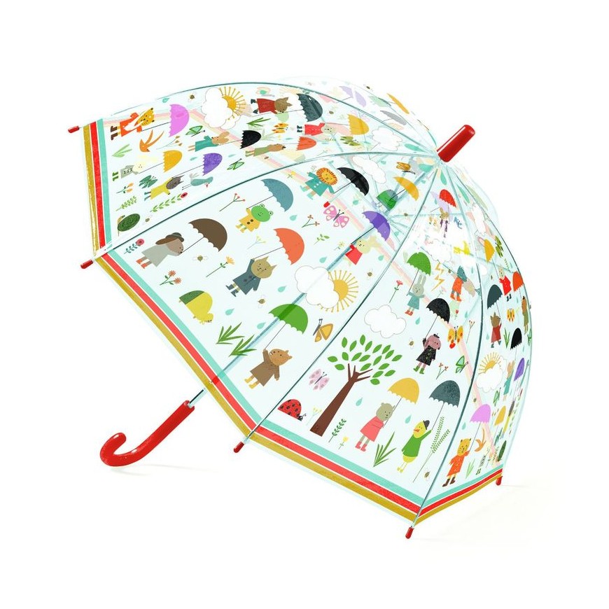 Un ombrello dai colori tenui illustrato con teneri personaggi "sotto la pioggia". La trasparenza permette al bambino di vedere dove va e l'apertura manuale con un sistema di protezione permette di aprire e chiudere senza pizzicarsi le dita. Un accessorio colorato, ideale per rallegrare le uscite sotto la pioggia! Dimensioni aperto: 68 x 70 cm di diametro.